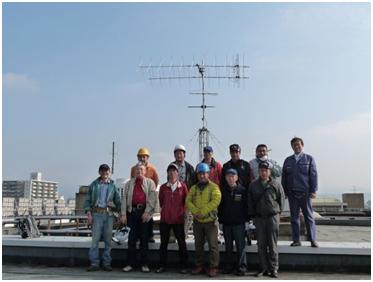 手分けしてタワーやアンテナなどの機材を屋上へ運び、屋上で組立を始めました。屋上へ上がれた人、断念した人それぞれで作業は、順調に運びました。
