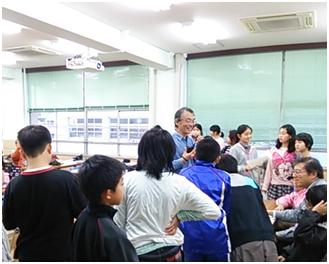 小学校に入ると、天体望遠鏡を準備している夫婦と出会いました。JO3OOP,OOQ藤原さん夫妻でした。他にも天文のかたが数人お見えになっていました。小学校の校長、教職員の方と初めてお会いし、歓迎を受けました。両校の先生に加えて若田さんと交信予定の児童21人と保護者、町の人、高校生数人が教室にあつまり、小学生21人と初対面となりました。ついにここまで来たのかということで、緊張してきました。