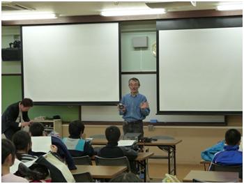 小学校に入ると、天体望遠鏡を準備している夫婦と出会いました。JO3OOP,OOQ藤原さん夫妻でした。他にも天文のかたが数人お見えになっていました。小学校の校長、教職員の方と初めてお会いし、歓迎を受けました。両校の先生に加えて若田さんと交信予定の児童21人と保護者、町の人、高校生数人が教室にあつまり、小学生21人と初対面となりました。ついにここまで来たのかということで、緊張してきました。