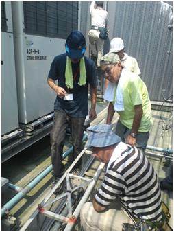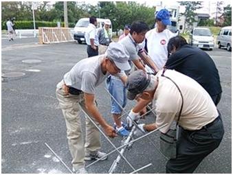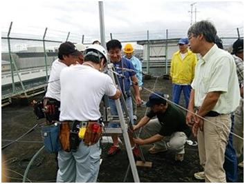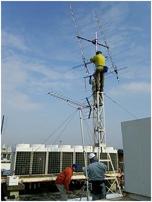 手分けしてタワーやアンテナなどの機材を屋上へ運び、屋上で組立を始めました。屋上へ上がれた人、断念した人それぞれで作業は、順調に運びました。