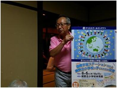 もう一つには、宇宙飛行士の写真を写しました。「ARISSスクールコンタクト」という横断幕は、学校で染色してもらう予定でしたが滲んでしまったということで紙を貼り合わせて学校で作ったということでした。関西アリスメンバーからは、宇宙飛行士やシャトルの風船が天井から吊るされて宇宙イベントらしくなってきました。